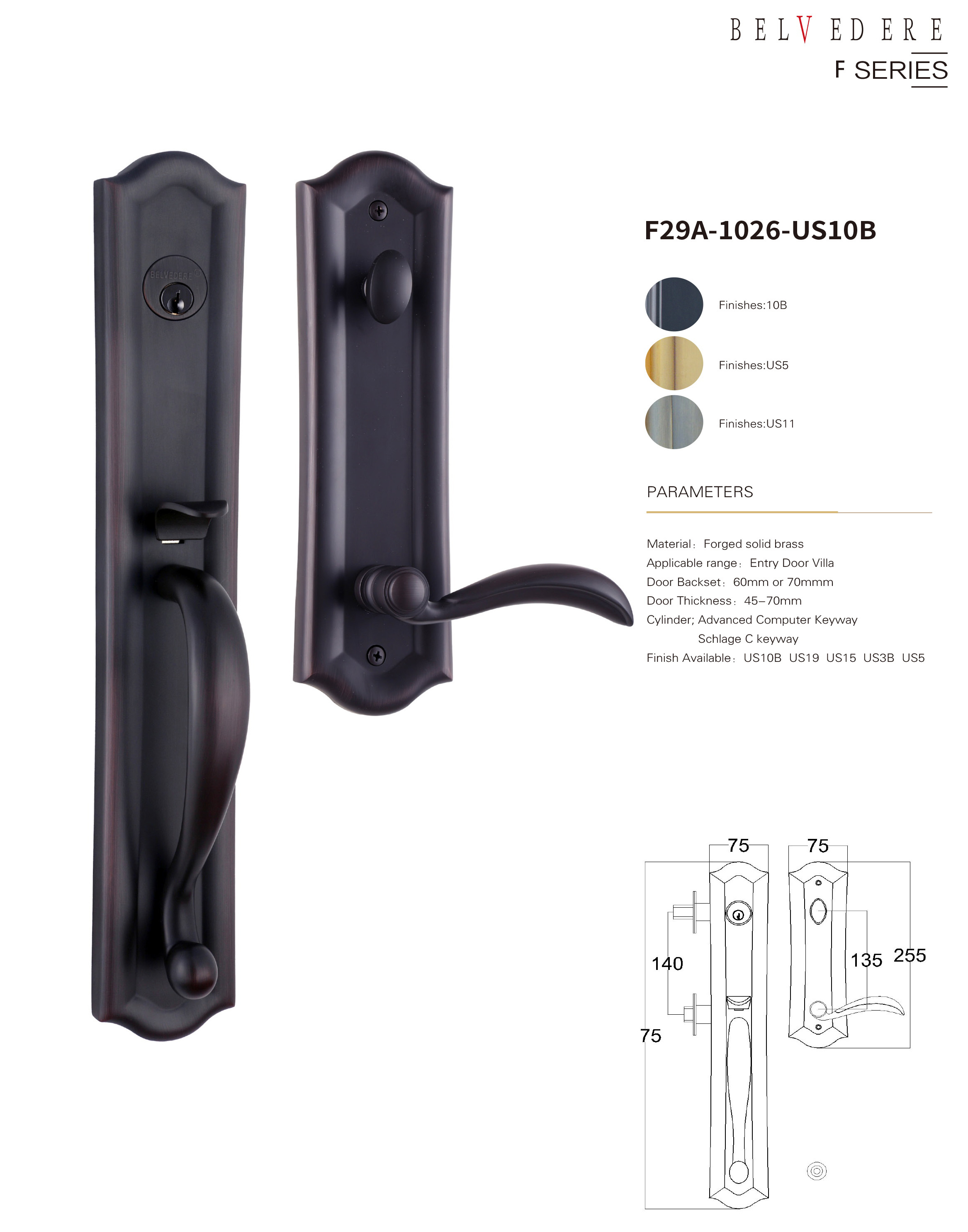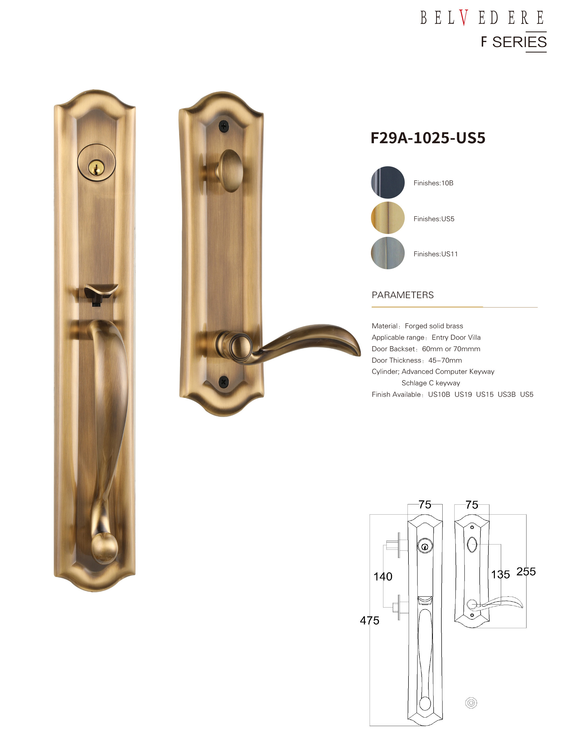 • 适配不同材质类型的别墅进户门:铜门,仿铜门,铸铝高,原木门,锻铁大门,防盗门等不同材质,从45-90mm不同厚度都能适配,单开门,子母门,双开门等不同风格