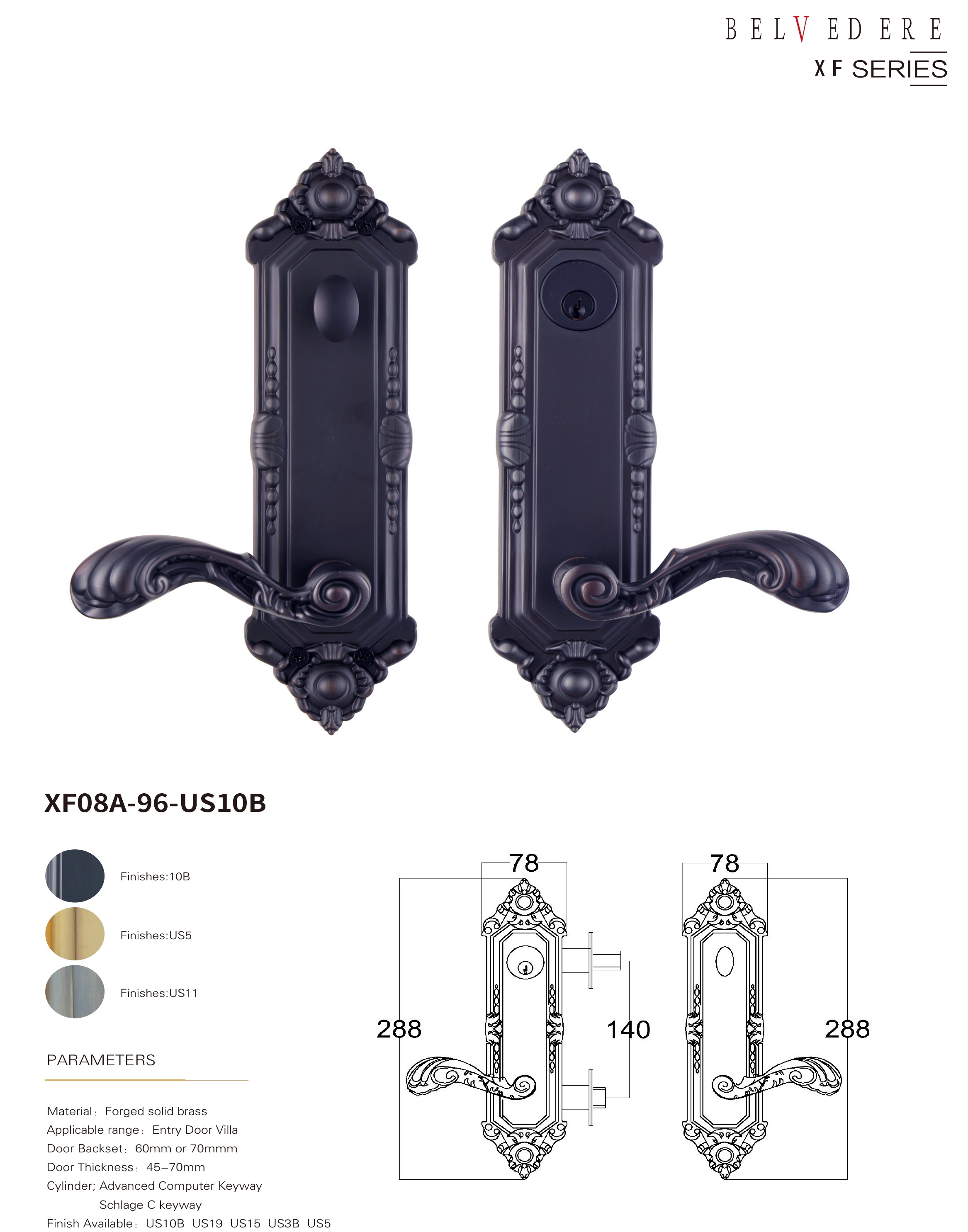 - 适配不同材质类型的别墅进户门:铜门,仿铜门,铸铝高,原木门,锻铁大门,防盗门等不同材质,从45-90mm不同厚度都能适配,单开门,子母门,双开门等不同风格