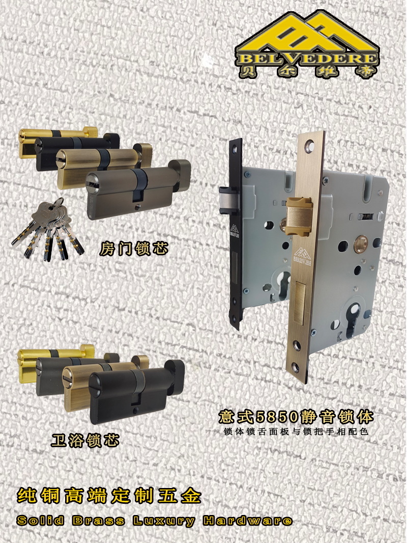 贝尔维帝铜锁,房门锁,卫浴锁,通道锁,假锁,广泛应用于各种不同风格,欧式,法式简欧,中式,新中式,现代风格的室内门,卧室门,卫生间门,厨房门,阳台门,书房门,储物间门等