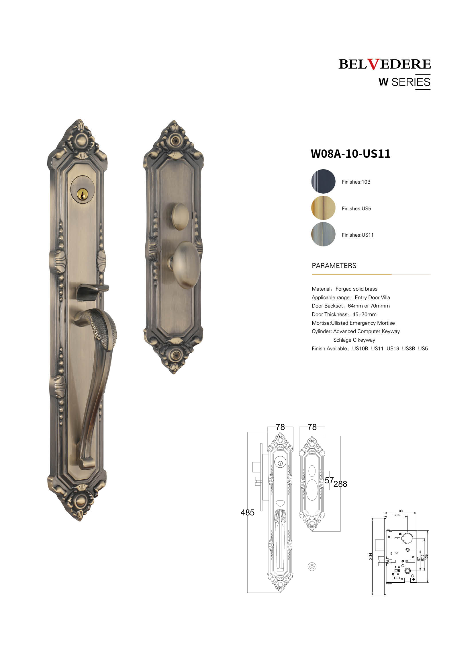 • 适配不同材质类型的别墅进户门:铜门,仿铜门,铸铝高,原木门,锻铁大门,防盗门等不同材质,从45-90mm不同厚度都能适配,单开门,子母门,双开门等不同风格